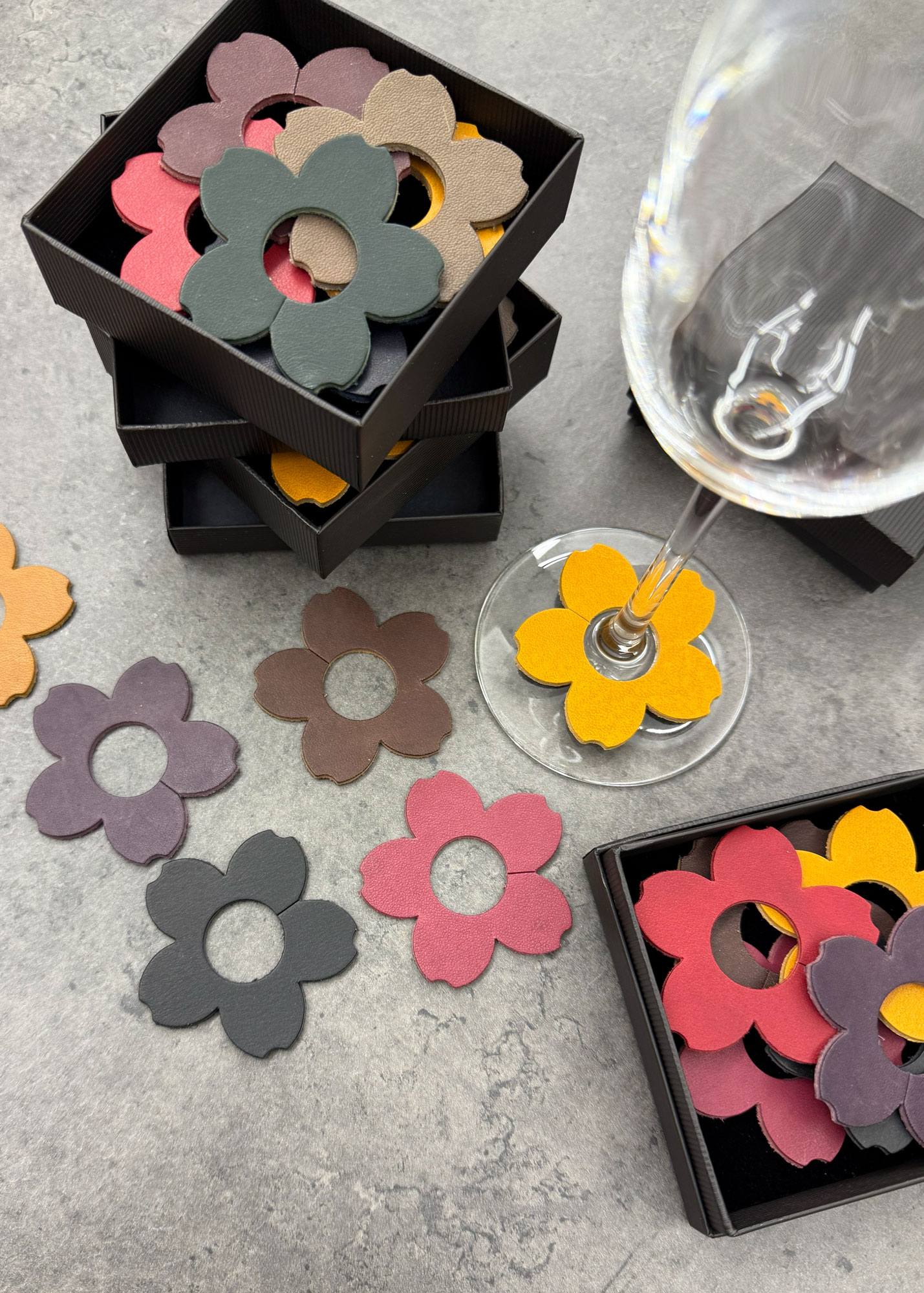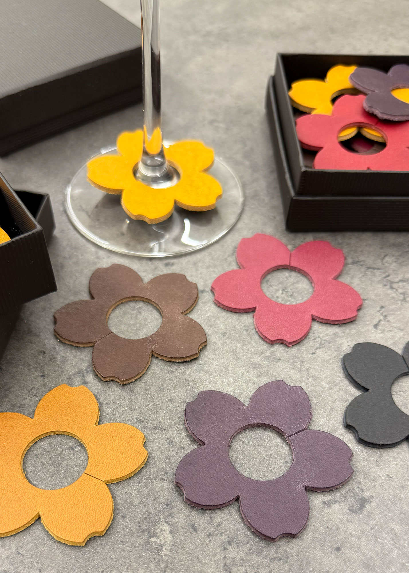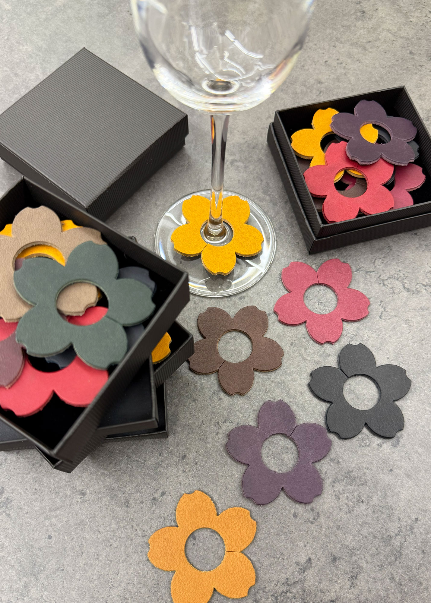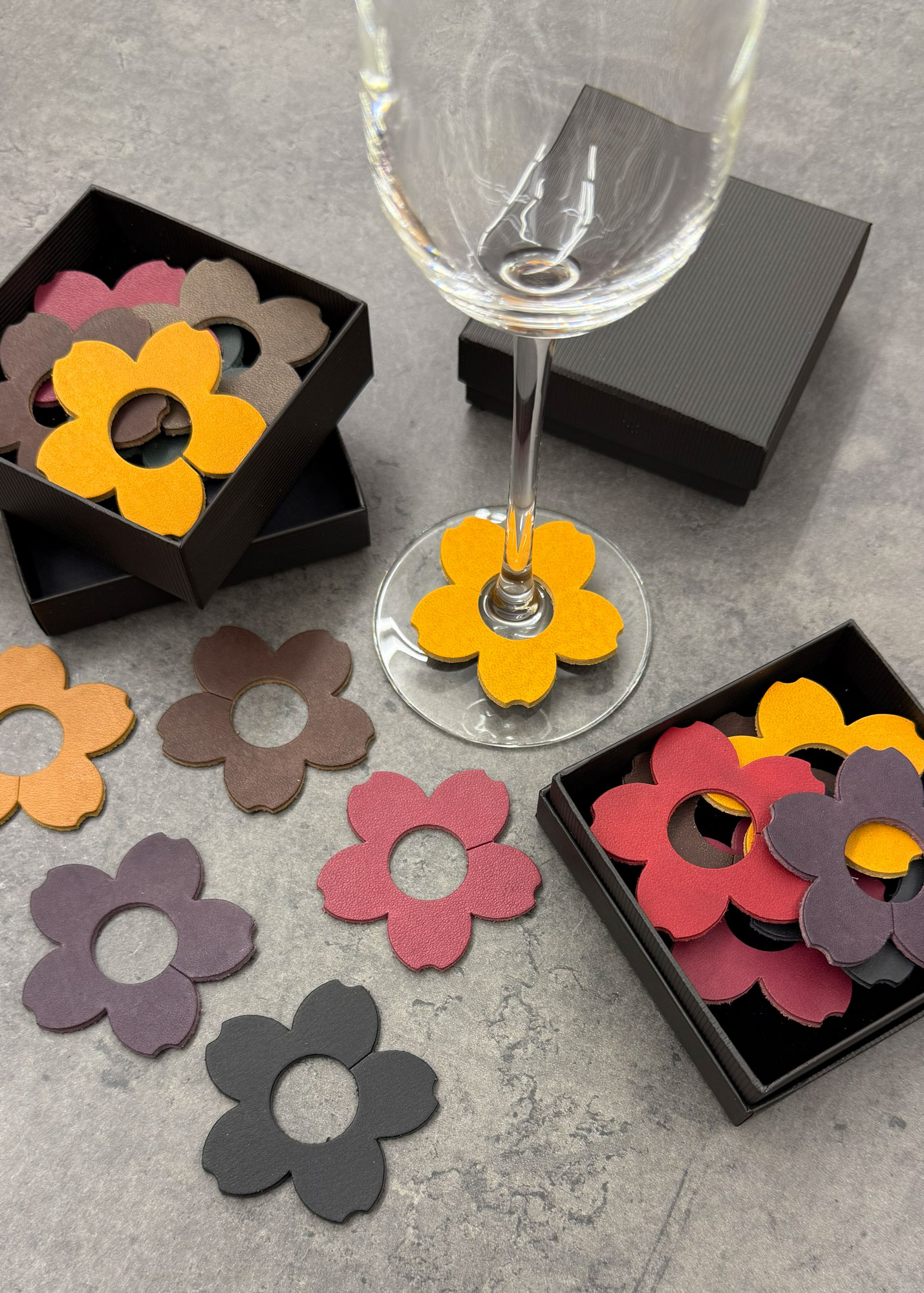 Das Glasmarkierer-Set ist ein schönes Accessoire für Tischkultur mit Stil. Die Blumen lassen sich um den Stil des Glases legen, so erkennen alle Personen am Tisch, welches Glas ihnen gehört. Das Set besteht aus einer bunten Mischung an Lederfarben, welche bei einer Bestellung nach Zufall für Dich ausgewählt werden. Das 6er-Set Glasmarkierer erhältst Du mit einer edlen schwarzen Kartonbox mit Schaumstoffeinlage. Das Glasmarkierer-Set «Fiora» aus pflanzlich gegerbtem Rindsleder aus Italien in minimalistischem Design wird von Hand in der Schweiz gefertigt.